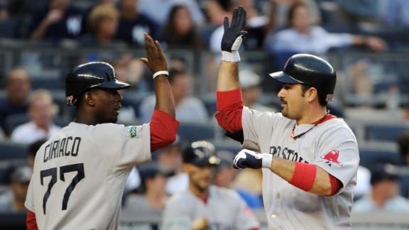 Down 6-1, the Yankees closed in on the lead in the fifth on Jayson Nix's two-run homer off Jon Lester and Derek Jeter's RBI grounder. After Teixeira's homer in the eighth, Rafael Soriano (2-1) walked Jacoby Ellsbury with one out in the ninth and Ciriaco hit a fly that could have been caught. Granderson broke in, then went back and turned the wrong way before the ball dropped to his right-field side as he fell. Dustin Pedroia followed with a sacrifice fly.Andrew Miller (3-1) got one out for the win, just the second for Boston in eight games against the Yankees this year. Alfredo Aceves finished for his 22nd save in 26 chances.Padilla and Teixeira have been going at each other in recent weeks. Padilla allowed a leadoff single to pinch-hitter Raul Ibanez in the eighth, then threw a called third strike past Jeter. Granderson hit two foul drives deep down the right-field line, the second missing a home run by about a foot, before striking out.Padilla fell behind 2-0 in the count to Teixeira, then lobbed in a 51 mph curveball. Teixeira turned on the next pitch, sending it deep into the right-field bleachers. He stared at the ball as he took four short steps up the line, then went into his home run trot.Teixeira hit a go-ahead, two-run triple off Padilla in the seventh inning at Fenway Park on July 6, sparking a weekend war of words. Padilla accused Teixeira of wronging Latino teammates when they played together on the Texas Rangers, and Teixeira said Padilla "didn't have a lot of friends in the game." Padilla responded Teixeira would "be better off playing a women's sport."Boston manager Bobby Valentine caused a stir befor the game when he said the Red Sox medical staff instructed him not to play Carl Crawford four days in a row, a mandate Valentine said he ignored earlier in the month after the left fielder came off the disabled list. Following a rain delay of 2 hours, 4 minutes, the Red Sox had built their lead when Adrian Gonzalez hit an RBI double and scored on Will Middlebrooks' two-run double in the first, then hit a three-run homer off CC Sabathia in the fifth.Chris Stewart's first home run since September cut the gap to 3-1 in the third, but Gonzalez boosted the lead with two outs in the fifth when he lined a home run into the right-field bleachers. Gonzalez leads the majors in batting average with runners in scoring position at .418 (41 for 98).New Yankees right fielder Ichiro Suzuki raced into the right-center gap to rob Gonzalez of an extra-base hit with a catch just in front of the warning track in the seventh.Lester, who had been 0-3 with a 10.42 in his previous four starts, allowed four runs and four hits in six innings with six strikeouts. He fanned Robinson Cano in the sixth for his 1,000th strikeout.Sabathia allowed a season-high six runs and eight hits in six innings. He retired 12 of 13 batters following Middlebrooks' double, then gave up Ciriaco's single and a walk on a close full-count pitch to Pedroia before Gonzalez's home run.Game notes